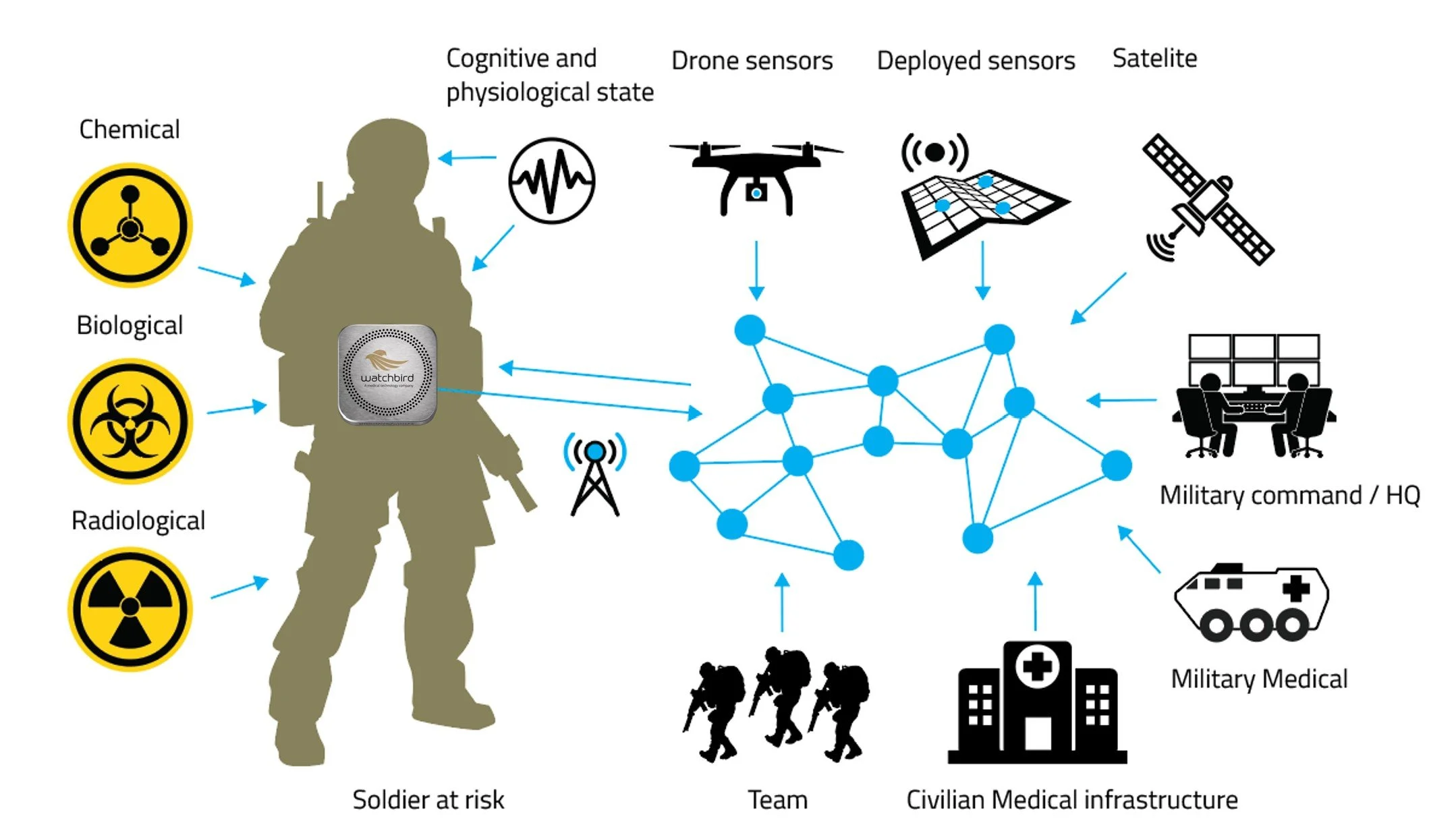 Watchbird® will develop, produce and deploy mini multi-sensors and equipment carried by personnel giving early warning, identification, diagnose, protection and rapid communication of CBRN exposure to the team and the command center, to protect and improve military performance and ensure operational capability.
